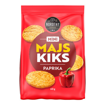 Nordthy Mini Corn Biscuits Paprika er sprø maiskjeks med en mild og krydret smak av røkt paprika