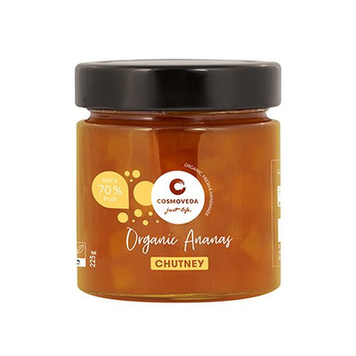 Cosmoveda Ananas Chutney har smaken av fullmodne ananas frukter og eksotiske krydder. Tilberedt etter Cosmoveda's egen klassiske oppskrift med utsøkte økologiske ingredienser.