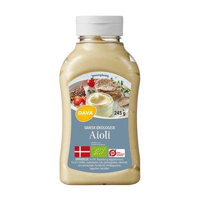 DAVA Aioli Ø er en kremet og smakfull økologisk hvitløksmajones laget med danske eggeplommer og dansk rapsolje. Aiolien har en deilig, balansert smak og en myk konsistens som gjør den ideell som tilbehør til mange retter. Aiolien er produsert med fokus på kvalitet og økologi, slik at du kan nyte et produkt som er bra for både smaksløkene og miljøet.