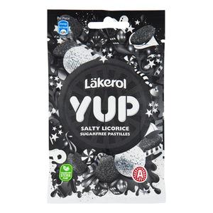 Läkerol YUP Salty Licorice er sukkerfrie salte pastiller søtet med stevia. De store myke lakrispastillene er drysset med salmiakkrystaller - Perfekt til deg som elsker lakris!