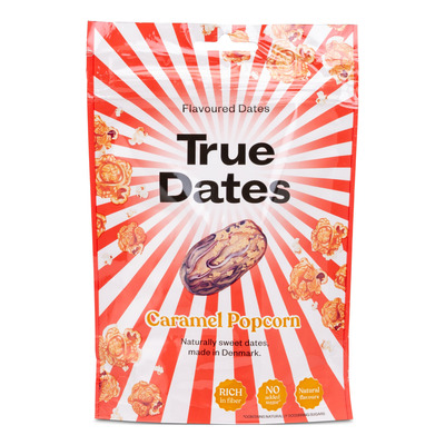 True Dates Caramel Popcorn består av 90 % utsteinede dadler med karamellpopcornsmak. Disse dadlene er et deilig alternativ til tradisjonelt godteri. True Dates Caramel Popcorn er rik på fiber, er ikke tilsatt sukker og inneholder kun naturlige smaker. Hver bit gir en søt og litt salt smaksopplevelse med en karakteristisk popcornsmak.