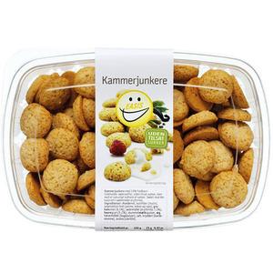 EASIS Kammerjunkere-kjeks inneholder ikke tilsatt sukker. De inneholder fiber og fullkorn, blant annet fullkornsmel og havregryn. De har en søt, krydret smak av vanilje og kardemomme og er litt mindre enn tradisjonelle Kammerjunkere-kjeks, noe som gjør dem lettere å spise. Prøv disse sprø kjeksene på toppen av din favorittkalde suppe.