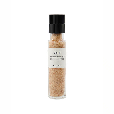 Dette saltet med hvitløk og rød chilipepper er den perfekte ledsager til all slags kjøtt og setter prikken over i'en, når du skal krydre dine retter. Den elegante flasken er forsynt med en smart kvern, så det er raskt og enkelt å tilføye ekstra god smak. Kvernens design gjør den egnet til å stå fremme og pynte på kjøkkenet.