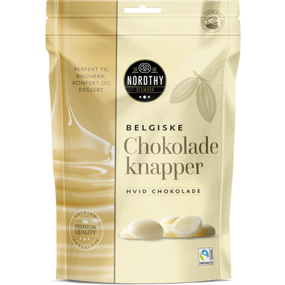 Disse sjokoladeknappene av hvit sjokolade fra Nordthy inneholder minst 25,7 % kakaotørrstoff. Sjokoladeknappene egner seg veldig godt til overtrekk på hjemmelaget konfekt og annet bakverk, da de lett kan smeltes over vannbad eller i mikroen.