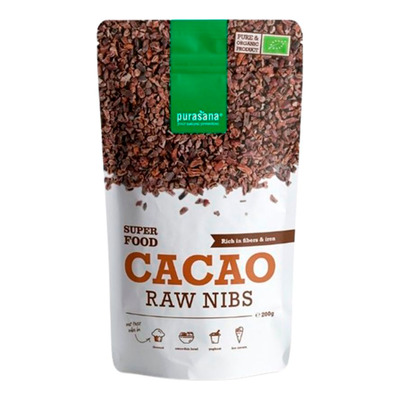Purasana Cacao Nibs – 200 g er små biter av rå, økologiske kakaobønner som er knust uten varmebehandling. Dette gjør at næringsinnholdet bevares – inkludert kraftige antioksidanter, fiber og viktige plantenæringsstoffer som bidrar til et sunt kosthold. Nibsene er helt uten tilsatt sukker eller smakstilsetninger, og gir en naturlig, intens kakaosmak.
