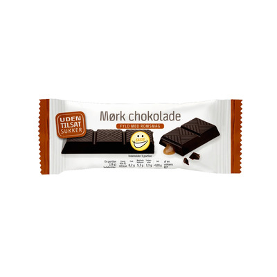 Kostfiber (oligofruktose), Kakaomasse, Kakaosmør, Kostfiber (dekstrin), Kostfiber (inulin), Søtstoff (erytritol) (6,2%), Fettfattig kakaopulver, Vegetabilsk fett (kokos), Emulgator (soyalecitin), Aroma (rom), Naturlig vaniljearoma, Søtstoff (steviolglykosider)