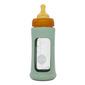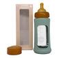 Hevea Wide Neck 250 ml. tåteflaske i glass med hylse i fargen Seafoam Blue gir varmebeskyttelse.