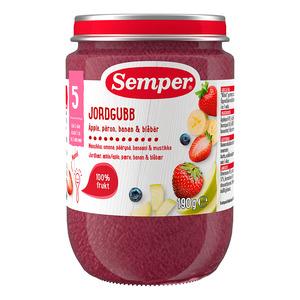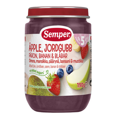 Semper Fruktpuré med jordbær, eple, pære, banan og blåbær Ø er et perfekt sommersnacks