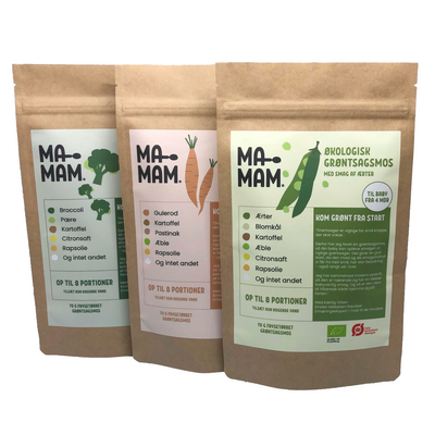 Pakke med tre varianter av Ma-Mam grønnsaksmos - næringsrik og smakfull grønnsakspuré med kun økologiske ingredienser