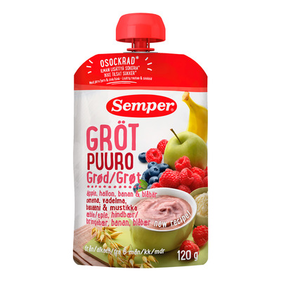 Semper Fruktgrøt med eple, bringebær, banan og blåbær er utviklet for å være fleksibel både hjemme og på farten. Når du er ute og går, kan du servere grøten direkte på en skje. Dette bidrar til å utvikle barnets evne til å spise med skje, noe som er en viktig ferdighet i den tidlige utviklingen. Hjemme kan du helle grøten over i en bolle eller på en tallerken. På den måten kan barnet utforske maten og lære seg å spise selv, noe som kan øke interessen og gleden ved måltidene.
