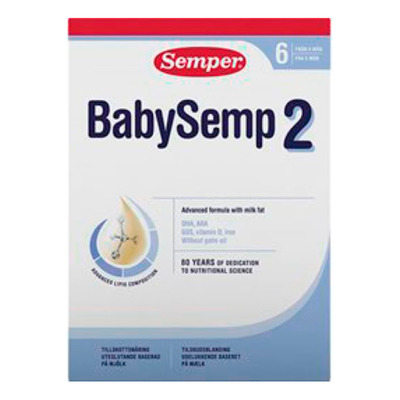 Semper BabySemp 2 er en tilskuddsblanding utviklet for barn fra 6 måneder. Den inneholder det prebiotiske kostfiberet GOS (galaktooligosakkarider) og viktige næringsstoffer som jern, vitamin D og jod. BabySemp 2 inneholder 1,0 mg jern per 100 ml premiks, noe som er viktig for oksygentransporten i blodet. I tillegg inneholder produktet 1,5 µg vitamin D per 100 ml, noe som betyr at barn som inntar 800 ml eller mer BabySemp 2, ikke trenger ekstra tilskudd av vitamin D. Hvis du er i tvil, bør du rådføre deg med helsepersonell.