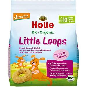 Holle Little Loops er økologiske speltkjeks med naturlig sødme fra Demeter-dadler. Kjeksene er laget av nøye utvalgte ingredienser uten tilsatt sukker, og har en mild smak som passer for små barn. Ringformen gjør dem lette å holde i hånden og ideelle som mellommåltid. Produktet er laget uten tilsetningsstoffer og inneholder et naturlig Innhold:: tiamin, som bidrar til normal energiomsetning.