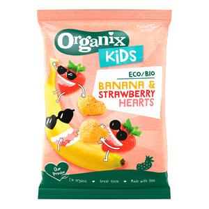 Banana & Strawberry Hearts er små økologiske snacks i hjerteform som kombinerer smaken av banan og jordbær. Disse deilige snacksene er laget for å smelte i munnen, noe som gjør dem til et perfekt tilskudd til fredagsmoroa med familien. Hver pose inneholder ekstruderte snacks formet som hjerter, rike på den delikate smaken av jordbær og banan. De er ikke bare smakfulle, men også morsomme for barn å spise, noe som gjør dem til en ideell snack å dele og gjøre snacktiden litt mer spesiell.