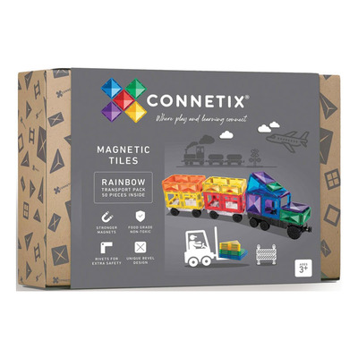 Connetix Transport Pack er et magnetisk sett med 50 deler som inspirerer barn til å bygge sine egne kjøretøy. Settet inneholder en grå, vendbar transportbase, to gjennomsiktige bilbaser med ekte gummihjul og ulike magnetiske deler i klare regnbuefarger. Barna kan eksperimentere med å bygge alt fra lastebiler og tog til brannbiler og gaffeltrucker. Alle delene har sterke magneter og er laget av matsikkert, giftfritt materiale.