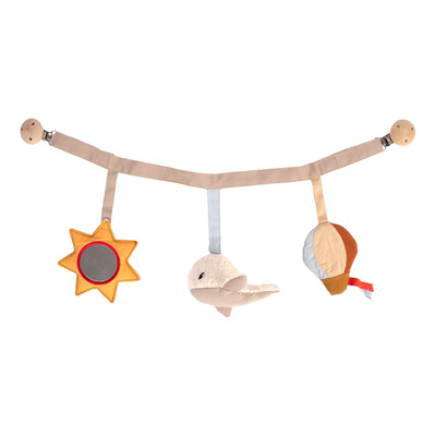 Filibabba barnevognskjede Dreamy Adventurers inneholder tre ulike figurer som stimulerer sansene. Hvalen er myk, ballongen knitrer og den lille stjernen har et speil. Hver detalj er designet for å stimulere barnets nysgjerrighet. Kjedet kan vaskes i maskin i en vaskepose på skånsomt program og bør brukes under oppsyn.