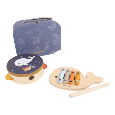 Filibabba Wooden Toy Suitcase - My First Instruments inneholder tre enkle musikkinstrumenter: en xylofon, et sett med kastanjetter og en tamburin. Alle delene er laget av tre og tilpasset små hender. Settet er oppbevart i en pappkoffert med metallhåndtak og hengsler, noe som gjør den enkel å ta med seg eller legge bort.