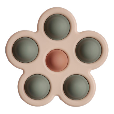 Mushie Flower Press Toy - Dried Thyme/Natural/Shifting Sand er en sansestimulerende leke formet som en blomst, designet for små hender. Rammen er laget av ABS-plast med myke bobler i 100 % matvaregodkjent silikon som barnet kan trykke på og sprette. Den styrker finmotorikken og oppmuntrer til nysgjerrig utforskning.
