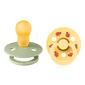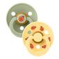 BIBS Studio Colour Ladybug Latex Sage Mix kombinerer funksjonalitet med en søt og unik design. Pakken inneholder to smokker i gult og grønt, begge dekorert med små marihøner. Det klassiske, runde BIBS-skjoldet har tre ventilasjonshull som sikrer god luftsirkulasjon og minimerer risikoen for hudirritasjon. Brystvorten er laget av myk naturgummilateks for en behagelig sugeopplevelse.