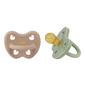 Hevea Orthodontic smokker er utviklet for babyer i alderen 3-36 måneder. Disse smokkene er usedvanlig myke og laget av 100 % naturgummi. De er fri for BPA, PVC, plast og ftalater, noe som garanterer et trygt og naturlig valg for babyen din. Den runde formen på smokken er den mest nøytrale formen som minner om mors bryst og sikrer at smokken alltid vender riktig i munnen. Den runde formen på smokken er behagelig for babyens tannkjøtt. Med FDA-godkjente fargepigmenter er Hevea smokkene også estetisk tiltalende med fargene Tan Beige & Moss Green.