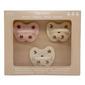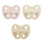 Hevea Trial Trio-Pack inneholder 3 smokker i de vakre fargene Powder Pink, Cream og Milky White med 3 ulike former på smokken.