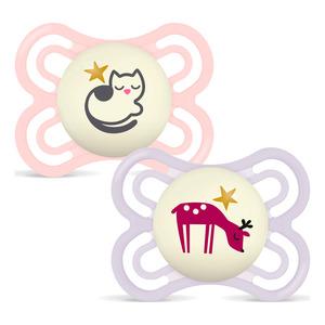 MAM Perfect Night Silk 0-6m Box Pink er en nattvennlig smokk med myk silikon og lett