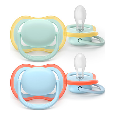 Philips Avent Ultra Air 0-6 m-smokken har ekstra store lufthull i skjoldet som lar huden puste og holder den tørr. Skjoldet og den medfølgende oppbevaringsboksen er laget av 80 % plantebasert materiale. Boksen kan brukes som sterilisator i mikrobølgeovnen ved å tilsette vann og varme opp i 3 minutter. Pakken inneholder to smokker i fargene grønn og blå.
