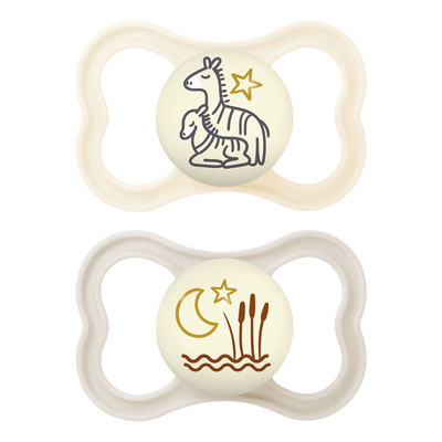 Smokkene i "Air Night"-serien fra MAM er ideelle for deg som leter etter en smokk til bruk om natten. Pakken inneholder to selvlysende smokker som er lett å finne i mørket. I tillegg er skjoldet designet med ekstra store luftehull som slipper inn mer luft til babyens hud og skåner den.