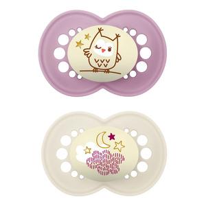 MAM Original Night er en klassisk smokk som er ytterst skånsom mot huden takket være store lufthuller i skjoldet samt nopret innside. Den er utstyrt med en selvlysende knopp, så den er lett å se i mørket. Selve sugedelen er fremstilt av bløt silikon.