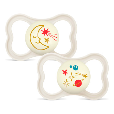 Smokkene i "Air Night"-serien fra MAM er ideelle for deg som leter etter en smokk til bruk om natten. Pakken inneholder to selvlysende smokker som er lett å finne i mørket. I tillegg er skjoldet designet med ekstra store luftehull som slipper inn mer luft til babyens hud og skåner den.