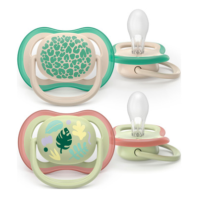 Philips Avent Ultra Air-smokk 6-18 m har ekstra store lufthull i skjoldet som lar huden puste og holder den tørr under bruk. Skjoldet og den medfølgende oppbevaringsboksen er laget av 80 % plantebasert materiale. Den kjeveortopediske utformingen støtter munnens naturlige bevegelser og bidrar til å redusere risikoen for skjeve tenner. Pakken inneholder to smokker i fargene hvit og grønn med motiv.