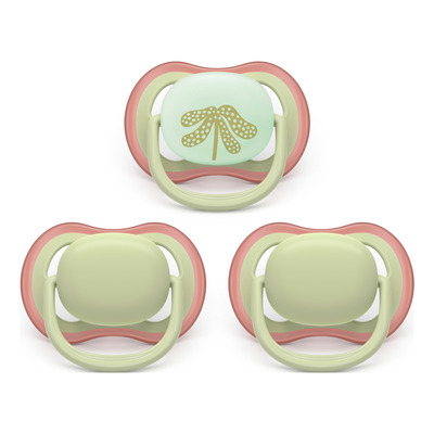 Philips Avent Ultra Air Day and Night 6-18 m turkis og grønn er et sett med tre smokker med selvlysende funksjon