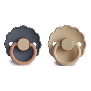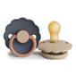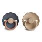 FRIGG Daisy Round Latex Aurora/Croissant - en 2-pakning med elegante, blomsterformede smokker i ulike størrelser.