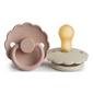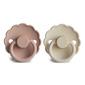 FRIGG Daisy Round Latex Blush/Cream er en 2-pakning med smokker som elegant etterligner blomster i søte farger.