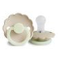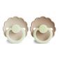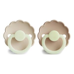 FRIGG Daisy Round Silicone Cream Night/Croissant night er en søt 2-pakning med blomsterformede smokker med selvlysende funksjon.