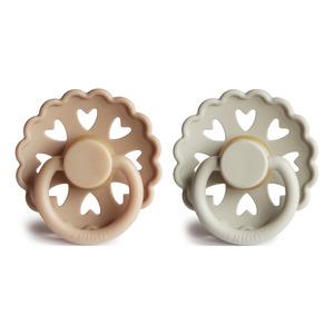 Denne 2-pakningen med smokker fra FRIGG er en del av Fairytale-kolleksjonen, som er inspirert av H.C. Andersens magiske eventyr. Med sine fine kanter er smokkene inspirert av H.C. Andersens papirklipp, mens de 8 små hjertene i skjoldet symboliserer kjærlighet og omsorg. FRIGGS Fairytale-smokker har en tut som med sin runde brystvorteform ligger godt i barnets munn og ligner mors bryst i både form og materiale. Denne typen smokk anbefales av fagpersoner innen pediatrien i Danmark.