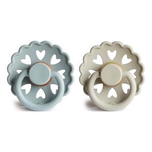Hver FRIGG smokkfarge er oppkalt etter H.C. Andersens kjente eventyr, noe som er med på å gi smokkene et gjennomgående fantasifullt preg. Denne 2-pakningen inneholder smokkene Kloss Hans/Willow Grey og Ole Lukkøye/Stone Blue.