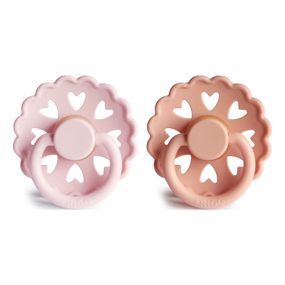 Denne 2-pakningen med smokker fra FRIGG er en del av Fairytale-kolleksjonen, som er inspirert av H.C. Andersens magiske eventyr. Med sine fine kanter er smokkene inspirert av Andersens papirklipp, mens de 8 små hjertene i skjoldet symboliserer kjærlighet og omsorg. FRIGGS Fairytale-smokker har en tut som med sin runde brystvorteform ligger godt i barnets munn og ligner mors bryst i både form og materiale. Denne typen smokk anbefales av fagpersoner innen pediatrien i Danmark.