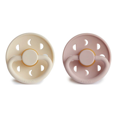 Denne 2-pakningen med smokker fra FRIGGS Moon Phase-kolleksjonen har et lateksskjold med månen i midten. Smokken er inspirert av månens bevegelser, og de skiftende månefasene vises på skjoldet og fungerer som lufthull som ventilerer babyens følsomme hud. Inspirasjonen fra månefasene fortsetter i håndtaket, som er formet som en halvmåne. Kjerneinspirasjonen til månetemaet kommer fra sitatet "I love you to the moon and back", som bidrar til å skape affeksjonsverdi for både barn og foreldre.