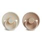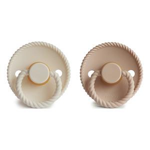 Denne 2-pakningen med smokker fra FRIGGS Rope-kolleksjonen har et lateksskjold omgitt av et tynt tau. Tauet skal få deg til å tenke på eventyr som involverer styrke, høyde og dybde. Tauet symboliserer stabilitet og trygghet i situasjoner der en aktivitet føles risikabel eller farlig. Smokkens håndtak er også utformet som et tau som man kan holde seg fast i. Samtidig symboliserer tauet også navlestrengen, som den første tiden i barnets liv var et sterkt bånd til moren.