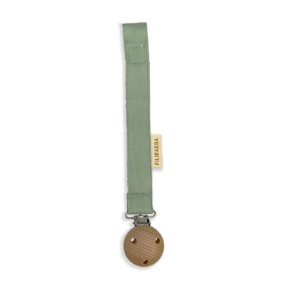 Denne varianten av smokkesnor med borrelås fra Filibabba er i fargen "Tender Green", som er en vakker støvete grønnfarge.