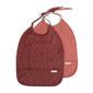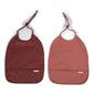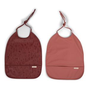 Smekkene er laget av 100 % PU med 100 % resirkulerbar polyester på baksiden, noe som gjør dem ekstra behagelige for den lille å ha på seg. De er også vanntette og svært enkle å rengjøre. Pakken inneholder 2 smekker i rødlige nyanser, men finnes også i andre farger og mønstre.