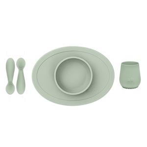 EZPZ First Foods Set er et komplett spisesett i stilig design utviklet spesielt for barn fra 4-6 måneder og oppover. Settet inneholder en bordskåner med innebygd bolle, 2 skjeer og en drikkekopp - alt i en vakker støvete grønnfarge og med en myk, silikonbelagt overflate som er skånsom mot tannkjøtt og nye tenner og sikrer et godt grep.