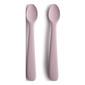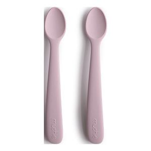 Mushie silikonskjeer Soft Lilac er en 2-pakning med babyvennlige skjeer som er skånsomme mot nye tenner og ganen.