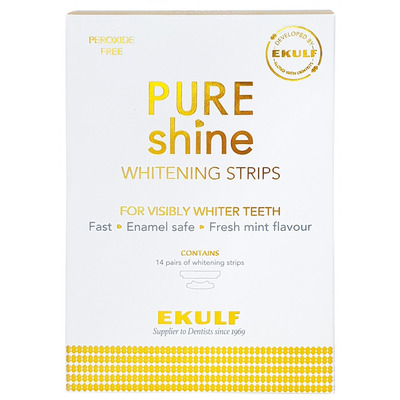 Pure Shine Whitening Strips fra Ekulf er skånsomme strimler utviklet spesielt til deg, som ønsker et hvitere smil. De er utviklet i samråd med tannpleiere, lette å bruke, fri for hydrogenperoxid (brintoverilte) og gir et synlig resultat etter få applikasjoner.