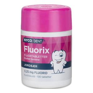 Nycodent Fluorix 0,25 mg fluortabletter med jordbærsmak bidrar til å styrke tennene og gjøre tannemaljen mer motstandsdyktig mot syreangrep. Disse tyggetablettene støtter også gjenoppbyggingen av allerede skadet tannemalje. Fluorix er egnet for både voksne og barn og skal suges eller tygges. Fluor i små doser bidrar til å forebygge hull i tennene og kan berolige følsomme tenner. Fluorix er et praktisk kosttilskudd som bidrar til normale tenner ved regelmessig bruk.