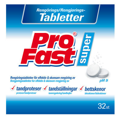 PROFAST rensetabletter for proteser fjerner effektivt rester av gammel PROFAST Superfixativ, og gjør at nytt fikxaktiv setter seg bedre fast.