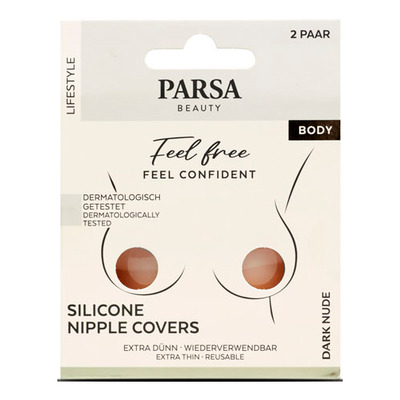Parsa Beauty Nipple Covers Silicone er dermatologisk testede brystvortebeskyttere i fargen dark nude. De er laget av ekstra tynn silikon for en glatt og usynlig finish under klærne. Det selvklebende materialet gjør dem enkle å påføre og fjerne uten ubehag. Utformingen gir naturlig dekning og føles behagelig mot huden, selv ved langvarig bruk. De er ideelle til bruk under stroppeløse, tettsittende eller gjennomsiktige plagg.