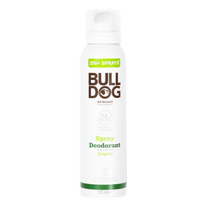 Bulldog Original Spray Deodorant er egnet for sensitiv hud og etterlater en tørr og frisk følelse hele dagen. Deodoranten er uten tilsatt aluminium og leveres i en 100 % resirkulert aluminiumsflaske, som også er fullt resirkulerbar. Inneholder 125 ml.