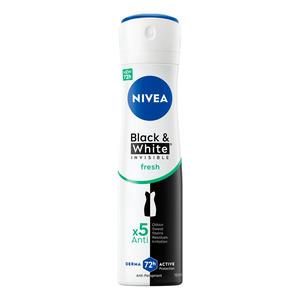 Nivea Black & White Invisible Fresh Deospray er en antiperspirant deodorant som holder deg tørr i opptil 48 timer. Deodoranten beskytter mot hvite og gule flekker på klærne. Den gir deg effektiv beskyttelse mot svette og lukt og pleier huden under armene. Deodoranten har en frisk duft med blomsternoter som gir en forfriskende følelse hele dagen. Spraydeodoranten er også dermatologisk testet.