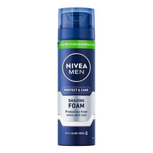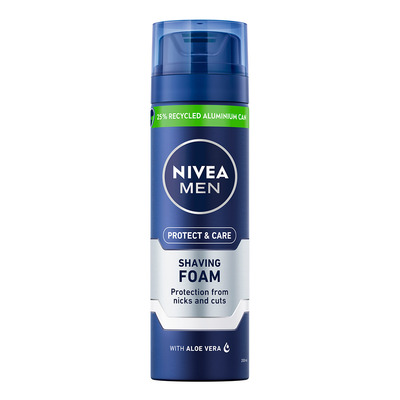 Nivea Men Protect & Care Shaving Foam er et barberskum for menn som gir en jevn og behagelig barbering. Barberskummet er formulert med aloe vera og pro-vitamin B5, som beskytter huden mot sår, kutt og en stram følelse på huden. Det bidrar til å styrke hudens naturlige forsvar og forbereder huden på barberingen. Barberskummet mykgjør skjegget og gjør barberingen mykere og mer behagelig.